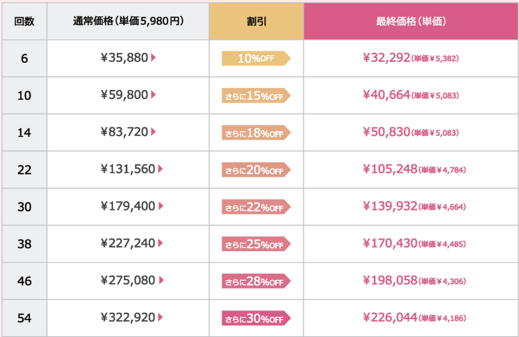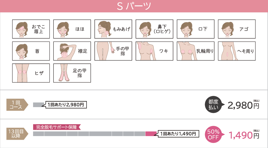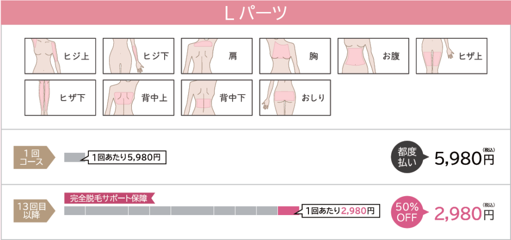Lパーツ、VIOパーツは1回分、Sパーツは0,5回分の回数消化で脱毛できます。